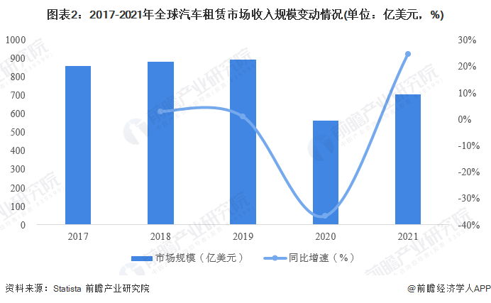 目前,世界汽车租赁市场发展势头迅猛,汽车租赁业的增幅遥遥领先于其他服务行业,日趋突出的规模化经营带来的效益规模化是全球汽车租赁业发展的潮流,从业务形式来看,国外汽车租赁企业已经开拓了相当数量的业务渠道和服务形式。在经营性租赁的基础上,同时开展融资性租赁、二手车销售、车辆保险等多种与之相关的业务。根据Statista公布的数据,2021年全球汽车租赁市场逐渐从疫情打击中恢复,收入规模达706.2亿美元,同比增长24.70%。