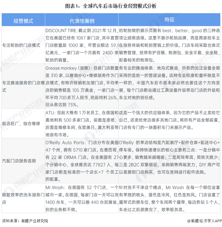 目前,全球汽车后市场行业成功的经营模式主要有五种:一是专注轮胎的门店模式,代表企业是美国的DISCOUNT TIRE;二是专注换油服务的门店模式,代表企业是Grease monkey(油猴);三是前店后厂,综合维修的模式,代表企业是德国的ATU;四是汽配门店服务连锁,盈利性最强的汽配连锁是美国的O’Reilly Auto Parts;五是极致效率的洗车服务门店,代表企业为德国的Mr.Wash。