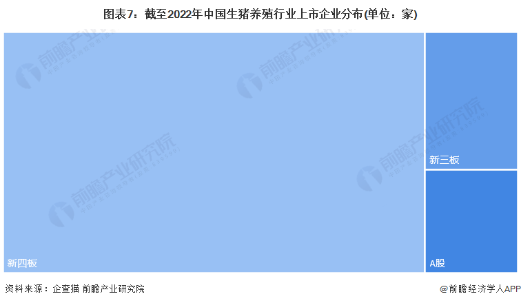 从生猪养殖行业企业上市情况来看,目前中国生猪养殖行业存续/在业的企业中有39家上市企业,上市率为0.21%。总体来看,我国生猪养殖行业企业上市率较低,上市企业主要以新四板挂牌为主,新四版企业共有32家。