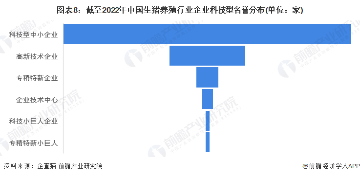 从企业科技型名誉分布情况来看,目前中国生猪养殖行业存续/在业的企业中,共有各类科技型企业近200家,其中有129家企业获得科技型中小企业称号,34家企业为高新技术企业、10家企业为专精特新企业。