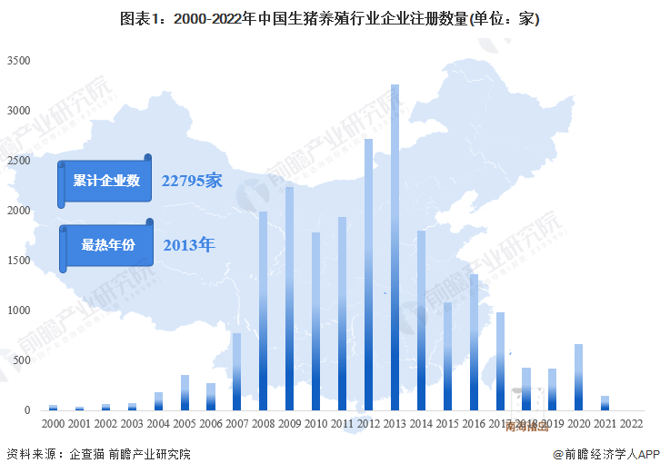 根据中国企业数据库企查猫,目前中国生猪养殖行业的主要企业共有22795家,其中以2013年为主要注册热潮,2013年全国生猪养殖注册企业数量达3265家;2021年,中国生猪养殖行业新增注册企业数量达143家,同比减少525家。
