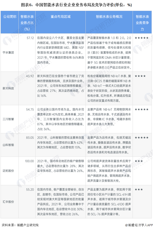 从区域来看,智能水表行业的上市公司均重点布局国内市场,新天科技、三川智慧、山科智能重点布局华东地区,迈拓股份、汇中股份重点布局华北地区;从智能水表业务情况来看,宁水集团涵盖全品类智能水表产品;新天科技、三川智慧以物联网水表、远传水表为主,而山科智能则专注于远传水表的制造;迈拓股份、汇中股份重点制造超声水表。