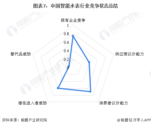 智能水表行业的替代品主要是传统的机械水表,机械水表虽然在价格上会有优势,但是并不符合长远发展需求,因而不会对智能水表产生威胁。总体而言,在替代品方面智能水表所面临的威胁主要来源于行业内部产品技术升级。由于当前智能水表行业进入/退出门槛不高,中低端企业数量较多,部分企业存在产能过剩现象,行业整体竞争程度是较激烈的。