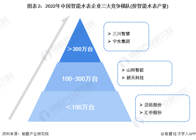 智能水表行业依据企业的产量划分,可分为3个竞争梯队。其中,智能水表产量大于300万台的第一梯队企业有三川智慧、宁水集团;智能水表产量在100万台-300万台区间的第二梯队企业有山科智能、新天科技;智能水表产量小于100万台的第三梯队企业有迈拓股份、汇中股份。