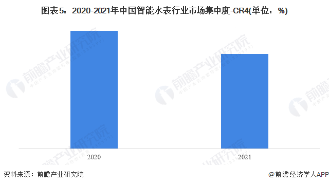 2021年,国内智能水表行业CR4为63%,较2020年降低了约8个百分点,市场结构为寡占Ⅲ型(50%≤CR4<75%),表明市场高度集中,少数厂商垄断市场。