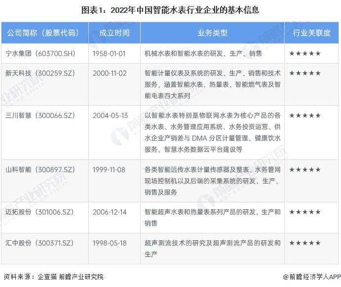 智能水表行业主要上市公司:宁水集团(603700.SH)、新天科技(300259.SZ)、三川智慧(300066.SZ)、山科智能(300897.SZ)、迈拓股份(301006.SZ)、汇中股份(300371.SZ)等