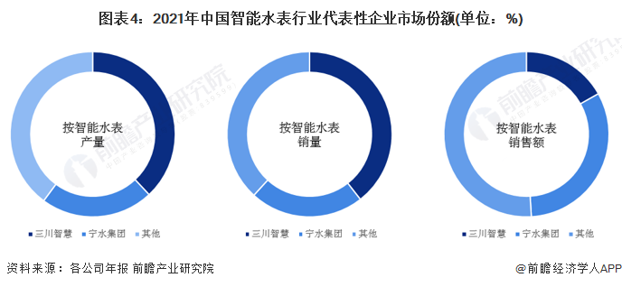 2021年,从智能水表产量情况来看,三川智慧智能水表产量占比38%,宁水集团占比22%;从智能水表销量情况来看,三川智慧智能水表销量占比39%,宁水集团占比22%;从智能水表销售额来看,三川智慧智能水表产量占比17%,宁水集团占比32%。