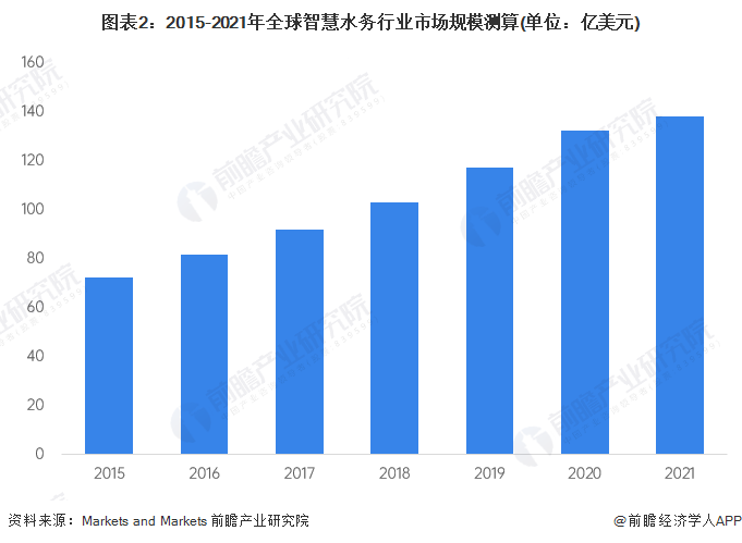 根据Markets and Markets的数据,2015-2021年全球智慧水务行业的市场规模不断上升,由2015年的72亿美元增长至2021年的138亿美元,年复合增长率达11.45%。主要驱动因素包括快速城市化对供水公司的质量和持续供水及相关服务造成巨大压力;快速采用先进技术来创新智能解决方案以应对日益增长的水行业挑战;对可持续生活的日益关注导致全球政府制定法规和法律以减少用水量;开发智慧化水处理解决方案等。