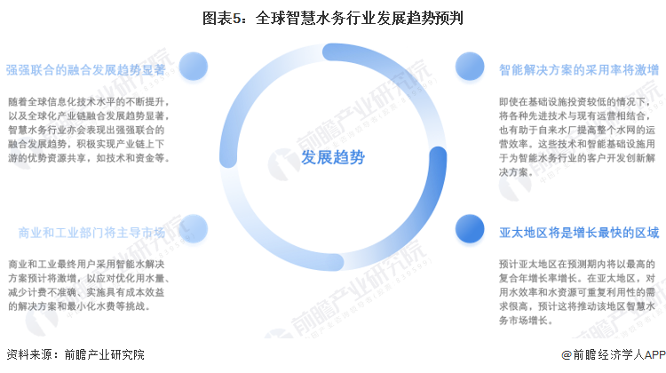 未来,随着全球信息化技术水平的不断提升,智慧水务行业亦会表现出强强联合的融合发展趋势;同时,商业和工业部门将主导市场,智能解决方案的采用率将激增。竞争格局方面,亚太地区将是全球智慧水务市场增长最快的区域,快速增长主要归因于以下因素:智能解决方案的采用率上升、城市化水平的增长导致用水需求激增、农业生产、公用事业部门的技术整合以及指数级人口增长。