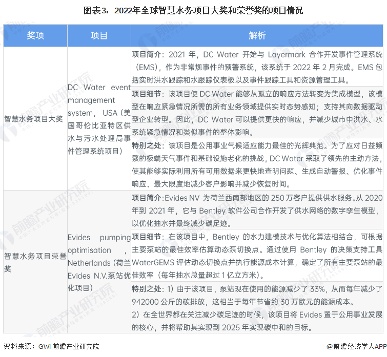 全球水奖(Global Water Awards)最早设立于2005年,是世界水务行业重要的奖项,被业界誉为水务行业的奥斯卡。全球水奖旨在为过去一年中在国际水务领域做出重要贡献的公司、项目进行表彰,被全球各地水务公司视为公司发展历史中的重要里程碑。2022年,获得全球智慧水务项目大奖和荣誉奖的分别是美国DC Water事件管理系统(EMS)项目和荷兰Evides N.V.泵站优化项目。