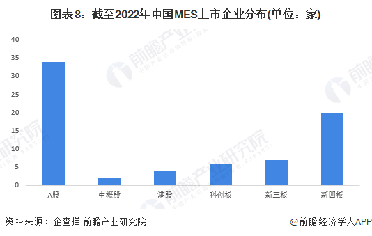 根据中国企业数据库企查猫,从上市情况来看,目前存续/在业的企业中有1554家未上市,总的来看,MES企业的上市率为4.49%。在上市的企业中,以A股的企业为主,A股企业有34家,新四板企业有20家。