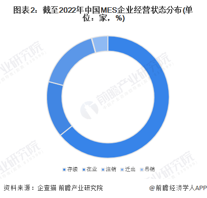 根据中国企业数据库企查猫,目前中国MES行业的存续企业1300家,占总企业数的64%;在业企业共301家,占比为15%;注销企业数量占总企业数的17%;吊销企业数量占总企业数的4%。
