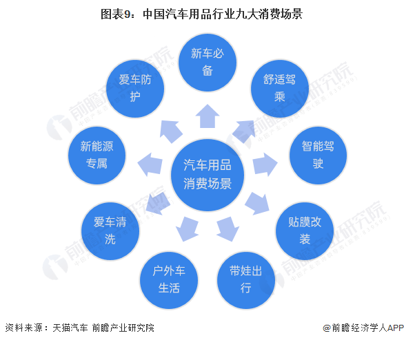 根据天猫汽车官方发布的《天猫2022汽车用品行业洞察报告》,我国汽车用品市场有九大消费场景:新车必备、舒适驾乘、智能驾驶、贴膜改装、带娃出行、户外车生活、爱车清洗、新能源专属、爱车防护。从消费升级角度来看,贴膜改装和户外车生活场景件单价增速最高,消费升级明显;从发展潜力角度来看,新能源专属场景消费规模增速最高,潜力巨大。