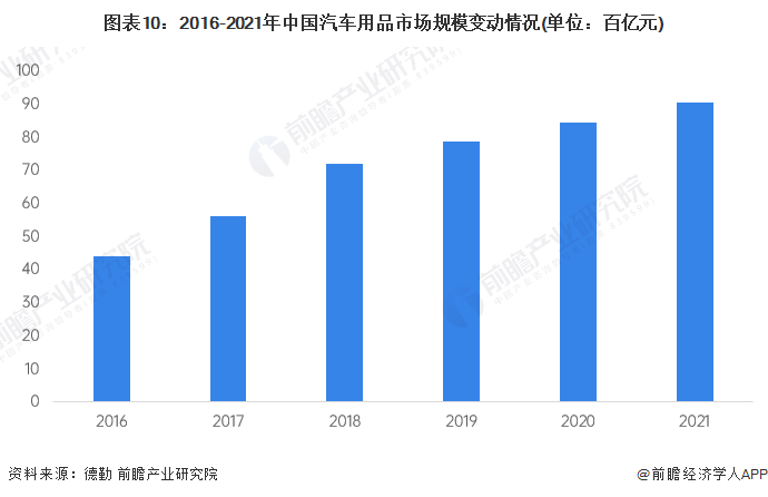 前瞻认为,汽车用品作为汽车保有的刚需产品,几乎每辆新增汽车车主都会不同程度的购买汽车用品,因此,前瞻估计我国汽车用品市场规模增速或将与每年汽车保有量增速大致相符,由此估算得到2021年我国汽车用品市场规模约为9100亿元。