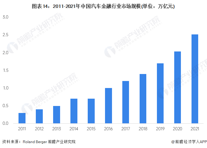 根据罗兰贝格2020年发布的汽车金融报告,2019年,我国汽车金融市场总体规模达到约1.7万亿元,五年复合增长率达19.42%,其中持牌汽车金融公司约占一半份额。经初步核算,2021年我国汽车金融市场规模或将达到2.5万亿元。