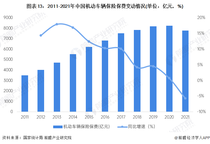 2011-2020年,我国机动车保险保费呈现出稳定的逐年增长趋势,但其增长率呈现出逐年下降的态势,这说明我国机动车保险保费增长开始趋缓,车辆保险业务从增量市场向存量市场过渡。2021年我国机动车辆保险保费为7772.68亿元,同比下降5.73%,首次出现负增长。