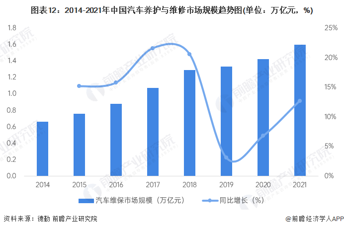 在繁杂冗长的汽车后市场产业链中,维保业务是消费者用车生命周期中“需求最刚性”、“消费频次相对较高”的细分产业之一,产业规模大且潜力巨大,汽车维保行业将在未来很长一段时间内成为后市场的明星赛道,持续吸引行业目光与资本的关注。根据德勤发布的《2020中国汽车后市场白皮书》,2020年我国汽车养护与维修市场规模约1.42万亿元,经初步核算,2021年市场规模将增至1.6万亿元。