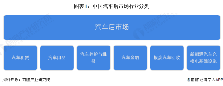 当前,我国的汽车后市场大体上可分为汽车租赁、汽车用品、汽车养护与维修、汽车金融、报废汽车回收、新能源汽车充换电基础设施等几类。