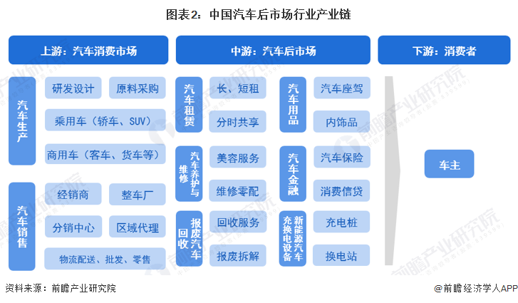 目前,我国汽车后市场行业产业链较为成熟,上游行业为汽车消费市场,包括汽车生产和汽车销售,汽车生产通常分为乘用车和商用车,汽车销售包括经销商、整车厂、分销中心、区域代理等;中游包括汽车租赁、汽车用品、汽车养护与维修、汽车金融、报废汽车回收和新能源汽车充换电基础设施;下游主要为消费者,即车主。