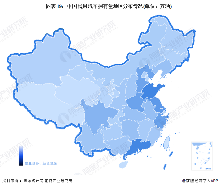 汽车后市场需求情况和市场规模大小受到汽车保有量的巨大影响,根据国际研究表明,汽车行业内有一个“1∶8”的规律,即每生产1元的汽车,将产生8元的汽车后市场价值。因此在进行汽车后市场区域分析时,各地民用汽车保有量数据能一定程度体现不同地区汽车后市场需求情况。
