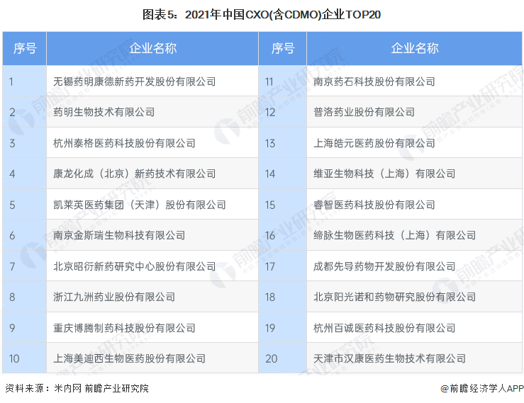 CXO(含CDMO)企业排行榜中,无锡药明康德新药开发股份有限公司高居榜首,位于前十名的企业还有药明生物技术有限公司、杭州泰格医药科技股份有限公司、康龙化成(北京)新药技术有限公司、凯莱英医药集团(天津)股份有限公司、南京金斯瑞生物科技有限公司、北京昭衍新药研究中心股份有限公司、浙江九洲药业股份有限公司、重庆博腾制药科技股份有限公司以及上海美迪西生物医药股份有限公司。