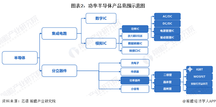 功率半导体按器件集成度可以分为功率分立器件和功率IC两大类。本文所指IGBT芯片是指具有独立功能的,用于实现功率转换的芯片产品,是IGBT分立器件的核心组成部分,经封装后成为IGBT单管、IGBT模组等。
