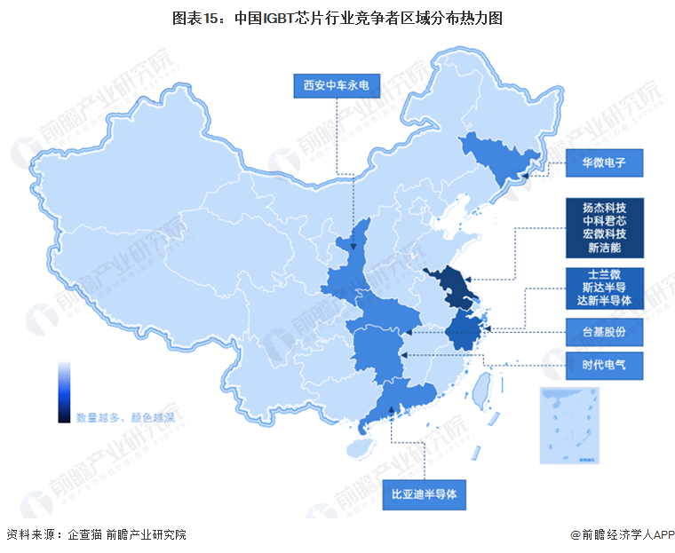 从中国IGBT行业竞争者区域分布状况来看,以江苏、浙江为代表的长三角地区代表性企业数量最多,代表性企业如士兰微、斯达半导等。其他行业内代表企业分布较为分散,如华微电子位于吉林;时代电气位于湖南;比亚迪半导体位于广东等。