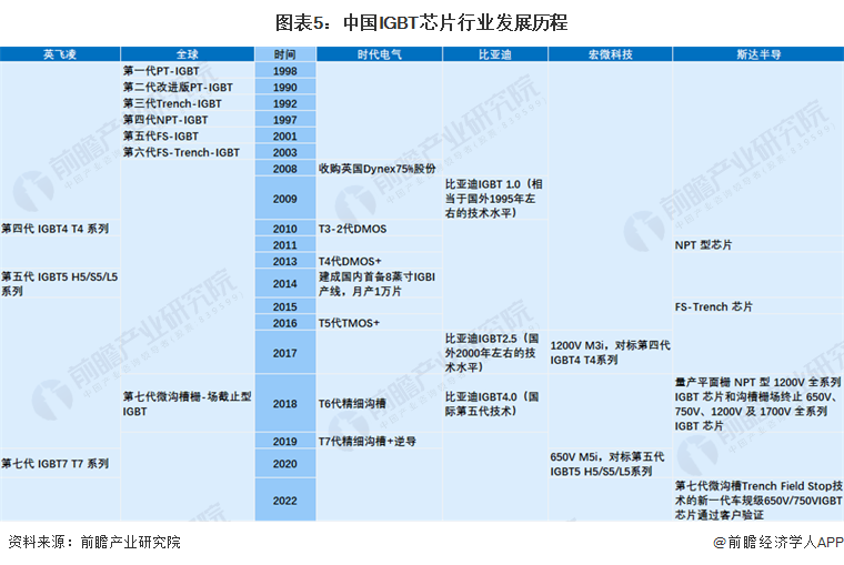 中国IGBT产品目前仍以1、2、3、4代为主,与国际巨头英飞凌、三菱电机等差距在10年以上,而步入第5代后,预计差距将缩短为10年,第6、7代产品差距将在5年以内。