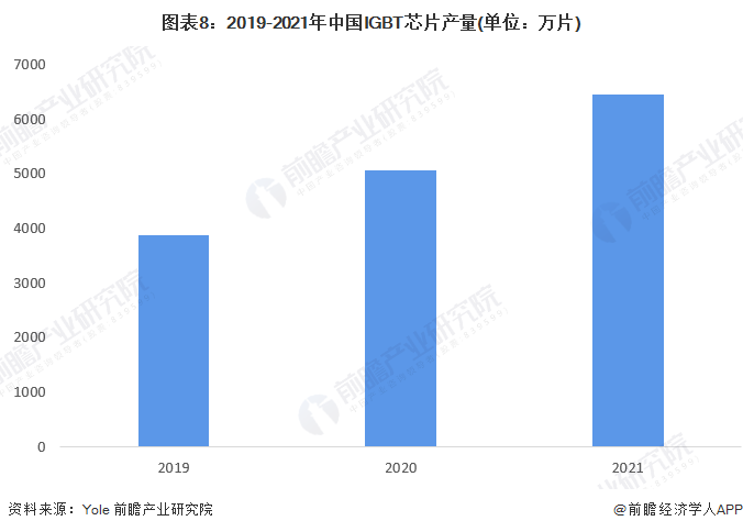 根据Yole的数据显示,2019-2021年我国IGBT行业的产量分别为1550万只、2020万只、2580万只。考虑到IGBT行业主要产品是模块,而模块主要采用多个IGBT芯片并联方式,模块内IGBT芯片用量主要与整体电流、电压规格相关;且我国IGBT厂商部分芯片采购于英飞凌等国际巨头,并非完全自产自销,综上,若以1:2.5的比例测算,2021年我国IGBT芯片产量约为6450万片。