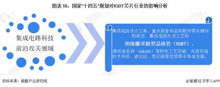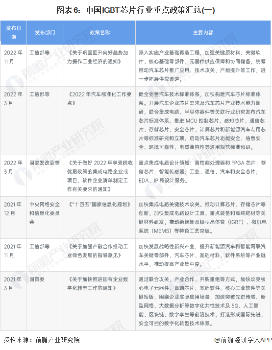 中国IGBT芯片相关政策规划较为丰富,在众多国家顶层政策规划文件中均有所涉及。如2021年11月发布的《“十四五”国家信息化规划》中明确指出,加快集成电路关键技术攻关。推动计算芯片、存储芯片等创新,加快集成电路设计工具、重点装备和高纯靶材等关键材料研发,推动绝缘栅双极型晶体管(IGBT)、微机电系统(MEMS)等特色工艺突破。