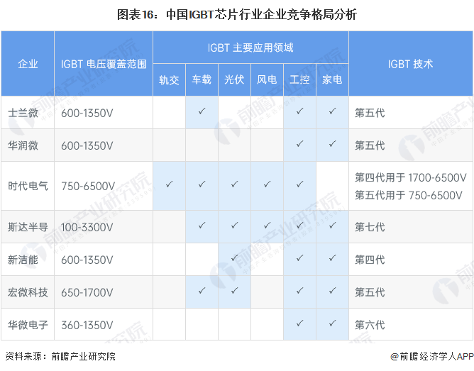 中国IGBT芯片行业代表性企业从技术格局来看,斯达半导应用第七代IGBT技术,电压覆盖范围为100-3300V;华微电子布局第六代IGBT技术,电压覆盖范围为360-1350V;士兰微、时代电气、宏微科技应用第五代IGBT技术;新洁能主要应用第四代IGBT技术。