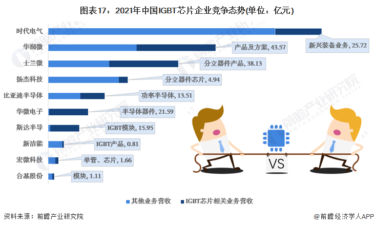 从中国IGBT芯片代表性企业营收状况来看,2021年,时代电气营收超过150亿元,庞大的规模体量为IGBT芯片发展提供了坚实平台,IGBT芯片所处的新兴装备业务板块在2021年实现了25.72亿元;其次为华润微,营收为92.49亿元,实力较强,产品及方案业务营收达到了43.57亿元;再次为士兰微,营收为71.94亿元,其中分立器件业务营收达到了38.13亿元。