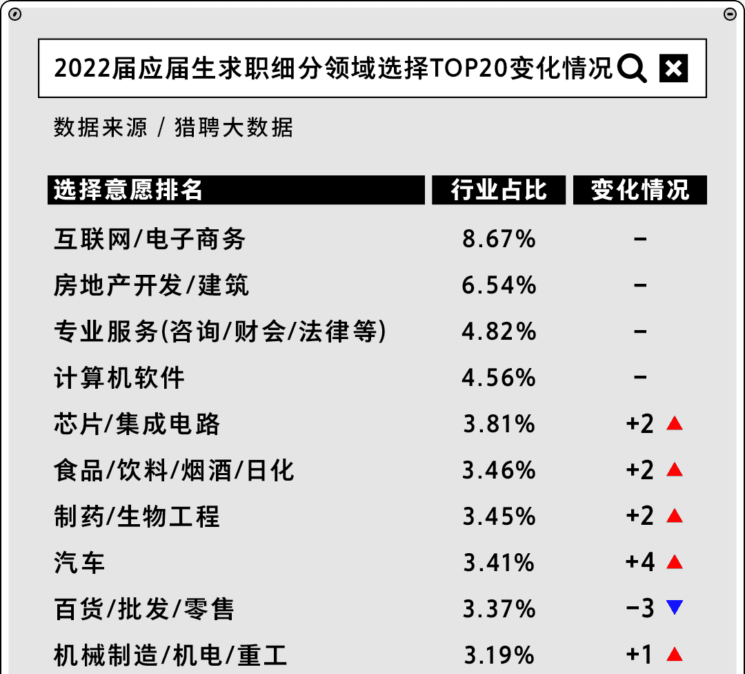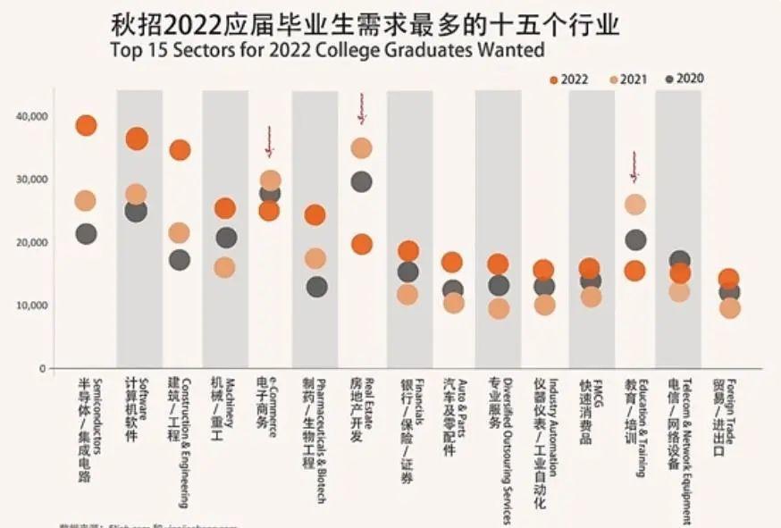 互联网与房地产依然是就业意向最高的热门行业,除了上面提到的芯片行业攀升,快速消费品/制造行业也呈上升趋势,或许和疫情影响下人们求稳的工作态度相关。