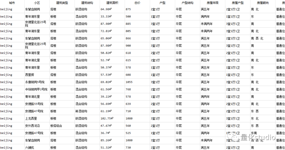 本文目前提供北京地区17个城区东城、西城、朝阳、海淀、丰台、石景山、通州、昌平、大兴、亦庄开发区、顺义、房山、门头沟、平谷、怀柔、密云、延庆的二手房数据,包括以下内容: