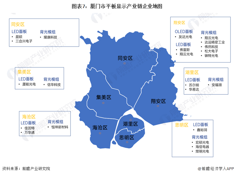从产业链各环节的代表性企业分布地图来看,目前厦门市各辖区均有LED面板与背光模组的企业分布,而OLED面板相关企业较少,主要为在翔安区的友达光电。