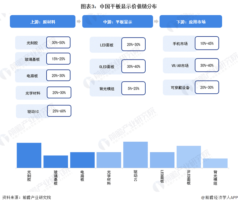 从中国平板显示价值链分布情况来看,上游原材料环节光刻胶、驱动IC毛利率较高,光刻胶毛利率在30%-50%之间,驱动IC毛利率在25%-60%之间;中游OLED面板毛利率较高,在30%-40%之间;下游应用市场中,VR/AR市场毛利率较高,在30%-40%之间。