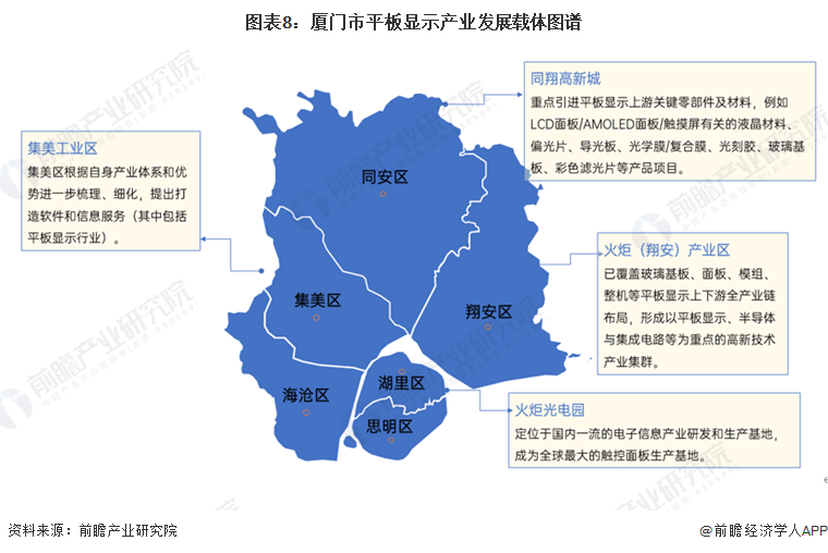 以新型显示为代表的电子信息制造业已经成为厦门重点支柱产业。主要园区载体为同翔高新城与火炬( 翔安) 产业区。当前厦门正在积极打造“芯—屏—端—软—智—网”一体的产业生态圈,持续推进新型显示与智能终端、集成电路、软件信息等产业融合发展。其中,平板显示产业是火炬高新区第一大产业。作为国家光电产业集群唯一试点单位,2021年火炬高新区平板显示产业规模位居全国前六,实现产值1544亿元,占全市的96.5%,已覆盖玻璃基板、面板、模组、整机等上下游全产业链布局,主要分布在火炬(翔安)产业区。