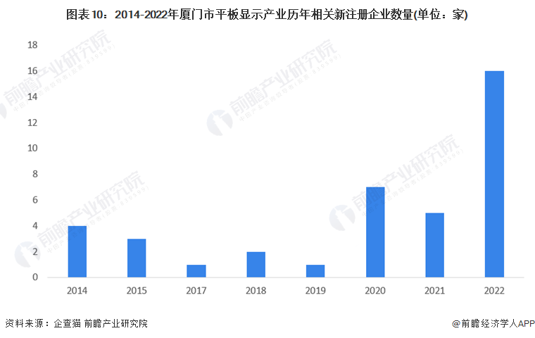根据企查猫查询数据显示,近年来平板显示历年新注册企业数量快速增长。截至2023年1月12日,厦门市平板显示产业相关的注册企业为155家,其中2022年新注册企业数量创历史高峰,达16家。