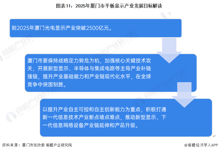 根据厦门市2021年发布的《厦门市“十四五”战略性新兴产业发展专项规划》,提出要推动新型显示、下一代信息网络设备产业链延伸和产品升级。力争到2025年,厦门光电显示产业突破2500亿元,打造具有世界领先水平的电子信息万亿产业集群。