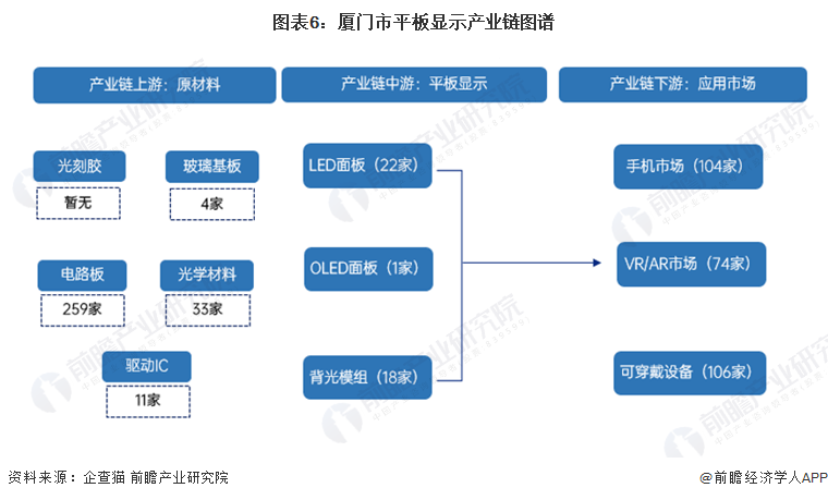 在政策指引和市场需求的驱动下,厦门市平板显示产业链不断完善,其中,在产业链中游,LED面板、OLED面板与背光模组环节均有企业布局,产业链上游光刻胶行业暂无企业布局,具体情况如下: