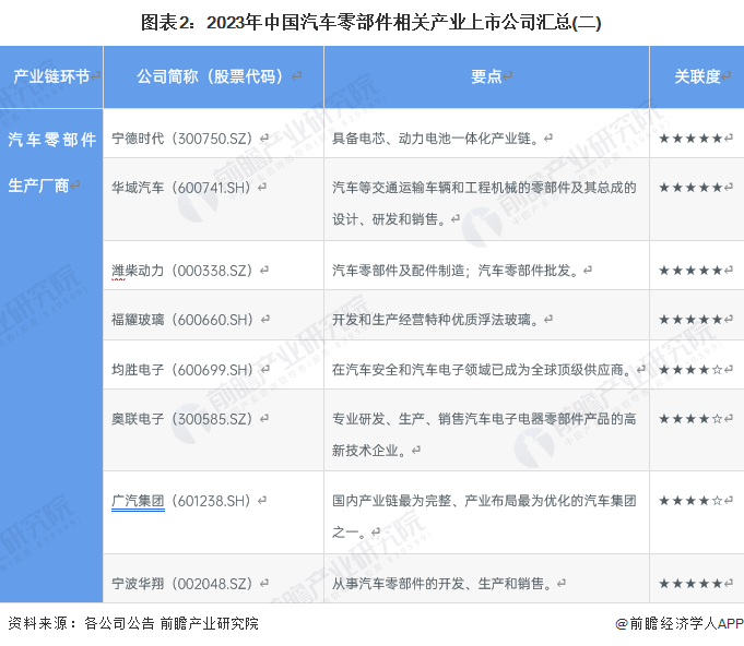 汽车零部件制造业的上下游产业主要是指其相关的供应和需求产业。汽车零部件制造业产业链上游主要包括提供原材料的市场,包括钢铁、有色金属、电子元器件、塑料、橡胶、木材、玻璃、陶瓷、皮革等。中游汽车零部件种类样式丰富,其中发动机组和电子控制系统属于汽车核心零部件。下游包括汽车整车制造厂商、汽车4S店、汽车修理厂、汽车零部件配件商和汽车改装厂等。中游环节中,华域汽车、广汽具有一定的产业规模优势;而宁德时代、福耀玻璃等深耕单一特定零部件领域,具有明显的龙头地位。