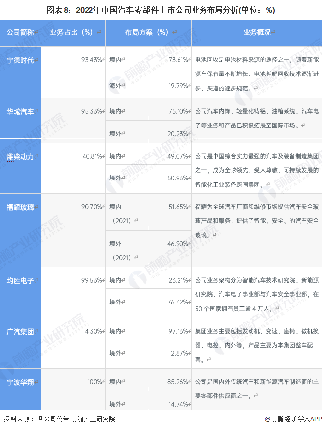 在中国汽车零部件行业的发展中,华域汽车、宁德时代作为汽车零部件领域的主要企业,在技术水平、业务规模方面拥有较大的优势。从整体行业上市企业布局来看,企业大多聚焦境内,但是境外业务的比重正在逐年增长。