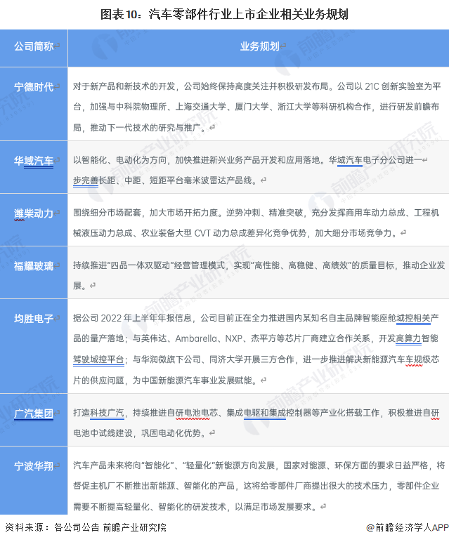 汽车零部件、新能源汽车行业的发展来对于国家来讲是关键的技术突破环节,近年来欧美国家对中国进行的“技术封锁”迫使我国在核心零部件、半导体等尖端技术环节逐步加快脚步,以追赶技术环节有较大领先的国外龙头。我国汽车零部件主要上市企业业务规划如下: