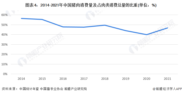 2014-2020年,中国猪肉消费量及占肉类消费总量的比重整体呈下降趋势。受2018年非洲猪瘟的影响,猪肉价格大幅上升,同时影响了消费者对猪肉质量的信任意识,2020年,中国猪肉消费量及占肉类消费总量的比重下降至39.94%。2021年,中国猪肉消费量及占肉类消费总量的比重呈现一定的上升趋势,上升至46.8%,较2020年上升了6.86个百分点。