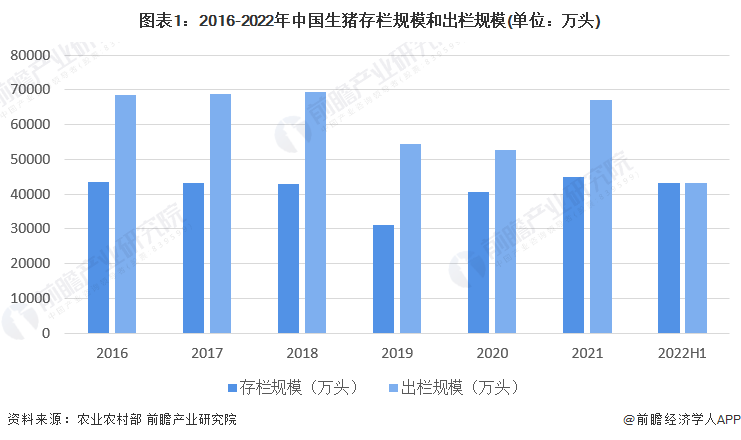 我国作为拥有悠久养猪历史的农业大国,生猪生产是农业的重要组成部分。2015年至2018年生猪年出栏量在7亿头左右,受非洲猪瘟疫情、“猪周期”以及部分地区禁限养等因素叠加影响,2019年我国生猪存栏及出栏数量产生较大程度的下降,根据农业农村部数据显示,2019年生猪存栏31041万头、出栏54419万头,非洲猪瘟疫情发生后,国家发布促进生猪生产恢复一系列政策措施,生猪生产形势开始好转。2021年全国生猪存栏44922万头,同比增长10.51%;出栏67128万头,同比增长27.37%。2022年,截至上半年底,中国生猪存栏规模和出栏规模均为43057万头。
