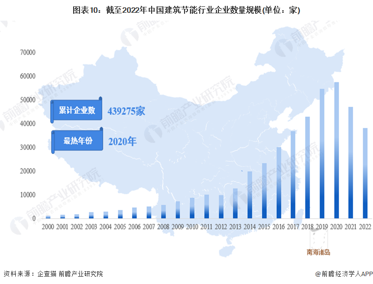 根据企查猫查询数据显示,近年来我国建筑节能行业新注册企业数量众多。截至2022年12月29日,中国建筑节能行业注册企业共有439275家,其中2020年新注册企业数量达到高峰,为57730家。虽然我国建筑节能行业内企业数量较多,但由于行业存在较高的资金、资质、技术门槛,目前尚未形成绝对的龙头企业,这主要受制于建筑节能发展领域广泛,从侧面印证建筑节能行业市场发展空间巨大。