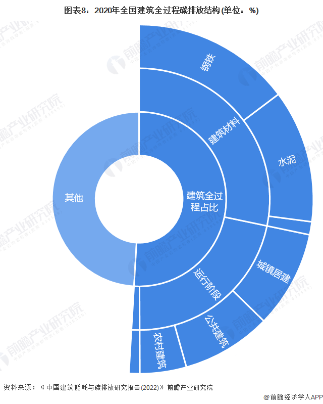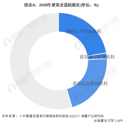 根据《中国建筑能耗与碳排放研究报告(2022)》,2020年全国建筑全过程能耗总量为22.7亿tce,占全国能源消费总量比重为45.5%。其中,建材生产阶段能耗1.1亿tce,占全国能源消费总量的比重为22.3%;建筑施工阶段能耗占比为1.9%;建筑运行阶段能耗占比为21.3%。