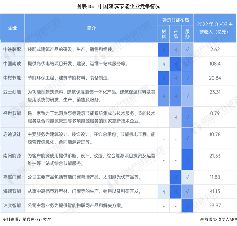 注:建筑节能布局情况,颜色越深,业务竞争力越强;“-”表示企业不专注布局该领域;盛世节能营收为2022年上半年数据。