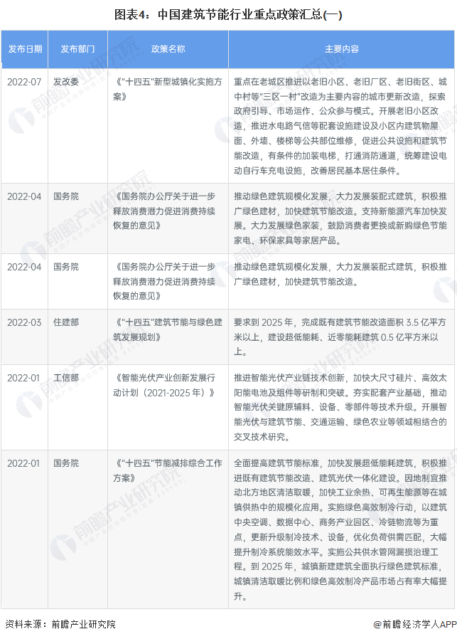 国家层面上,建筑节能产业相关政策较多。2020年我国作出“双碳”承诺,建筑行业迈入“碳中和”时代,逐步向零能耗、零碳建筑发展。2022年3月住建部发布《“十四五”建筑节能与绿色建筑发展规划》,要求到2025年,完成既有建筑节能改造面积3.5亿平方米以上,建设超低能耗、近零能耗建筑0.5亿平方米以上。
