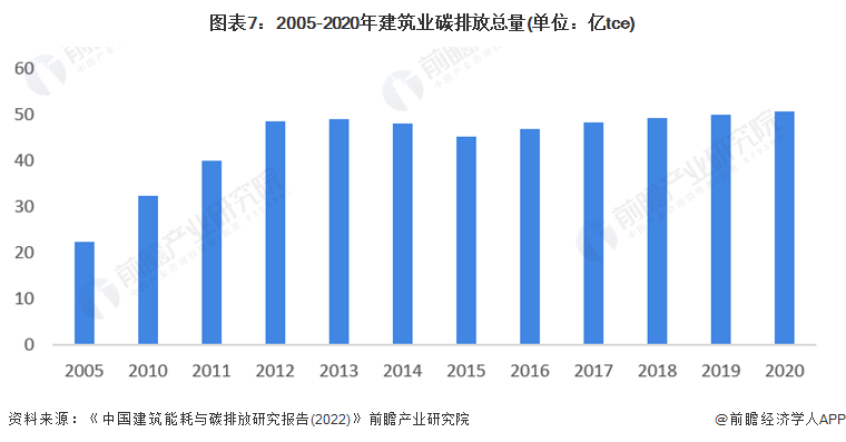 2005-2019 年间,全国建筑全过程碳排放由2005年的22.34亿吨二氧化碳,上升到2020年的50.8亿吨二氧化碳,扩大2.27倍,年复合增长率为5.6%。